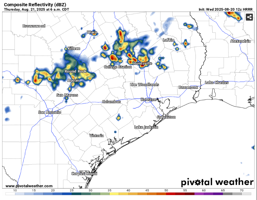 The boundary of a weak cold front will accompany this atmospheric disturbance and stall over Central Texas overnight and into Thursday, increasing rain chances. The latest high-resolution model indicates a cluster of storms will move into the Austin metro area around daybreak, likely slowing morning commutes to school and work. However, other forecast models show these storms diminishing after sunset as we lose the daytime heating that fuels them.